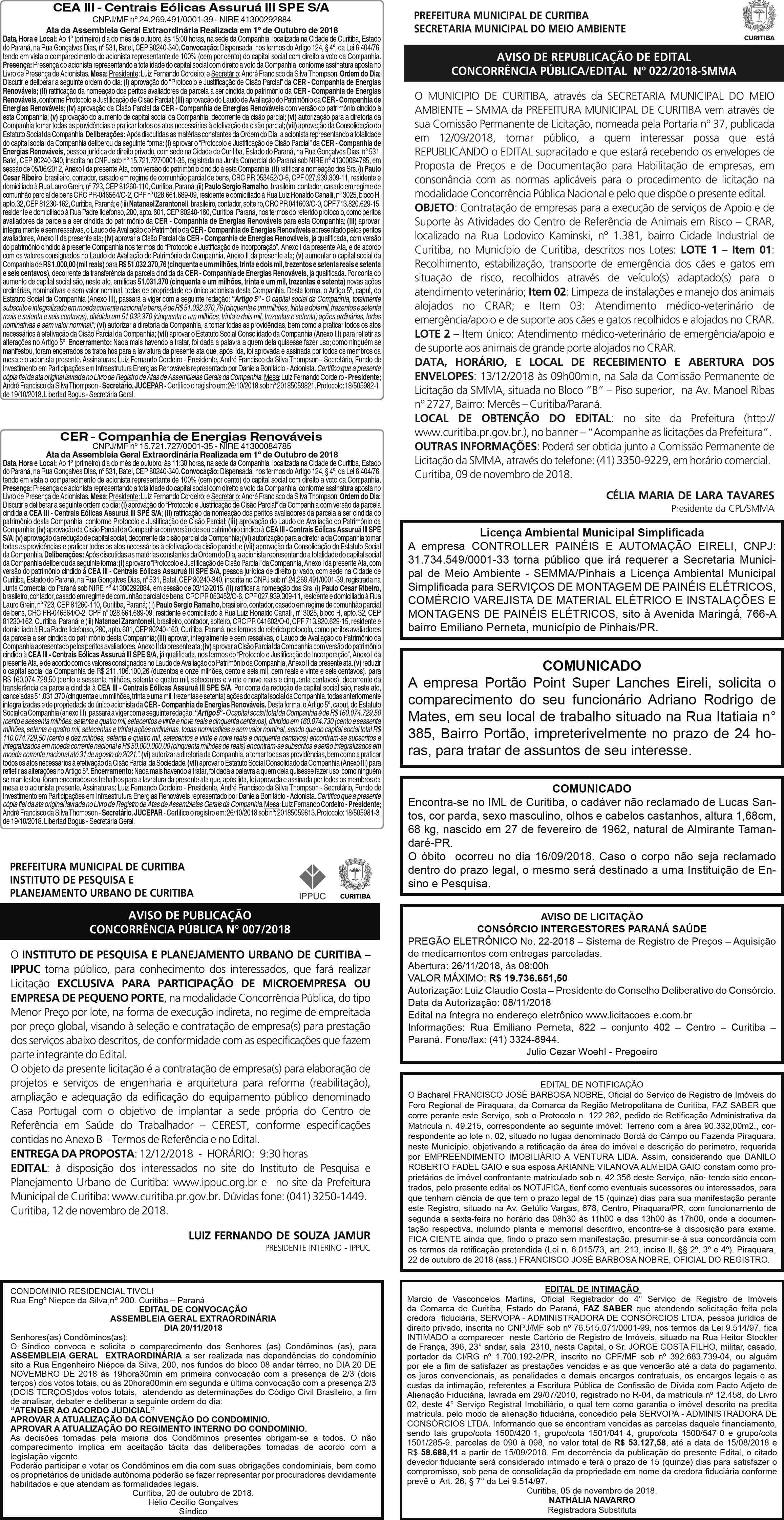 Publicidade Legal veiculada no jornal Tribuna do Paraná, em 27 de novembro de 2018, na página 09.