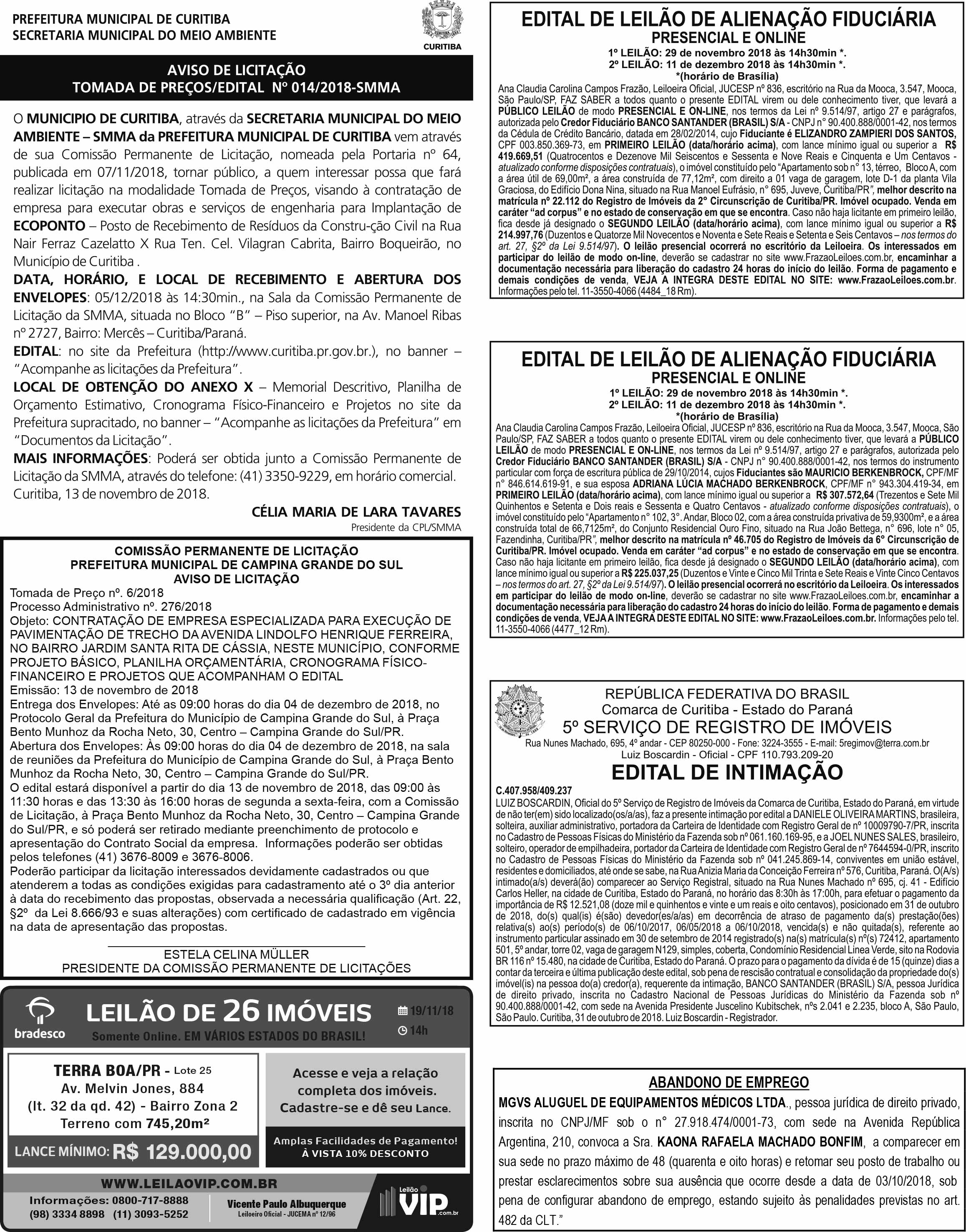 Publicidade Legal veiculada no jornal Tribuna do Paraná, em 27 de novembro de 2018, na página 10.