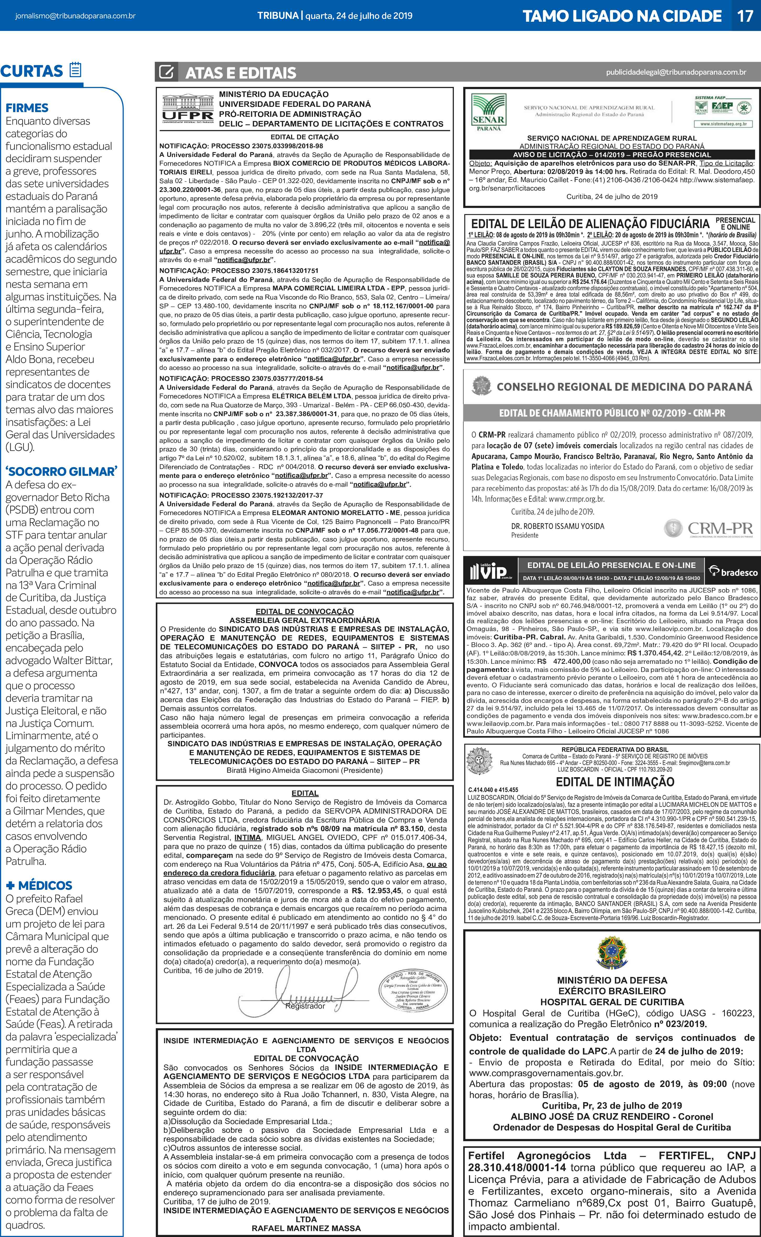 Publicidade Legal veiculada no jornal Tribuna do Paraná, em 24 de julho de 2019, na página 17.