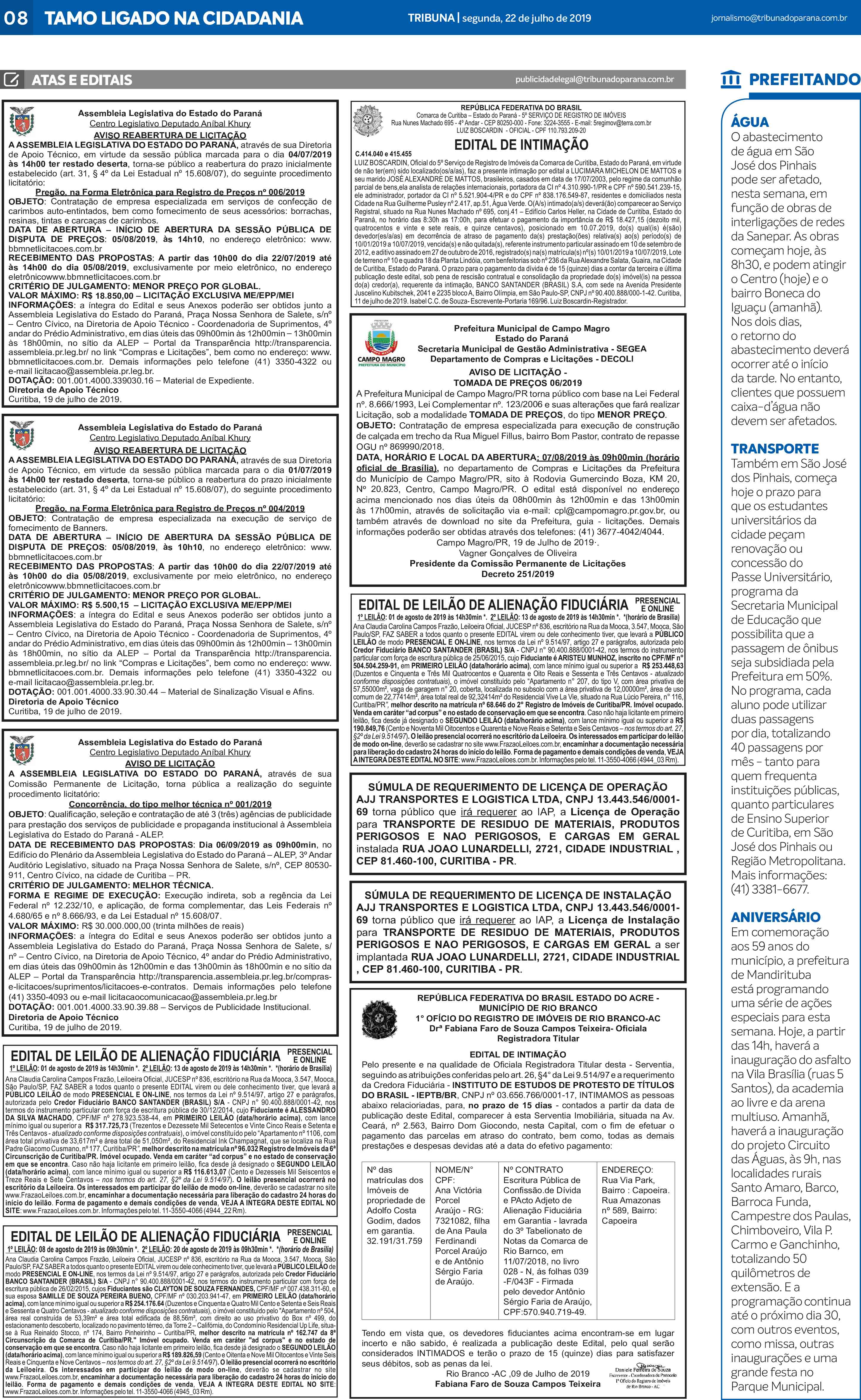 HomePublicidade LegalPublicidade Legal – 22/07/2019 Publicidade Legal – 22/07/2019 Publicidade Legal veiculada no jornal Tribuna do Paraná, em 22 de julho de 2019, na página 08. Fazer download Anunciantes nesta página: AJJ Transportes e Logística LTDA,assembleia legislativa do es,Leilão de alienação fiduciária - Presencial e On-Line,Prefeitura Municipal de Campo Magro,Republica Federativa do Brasil,República Federativa do Brasil