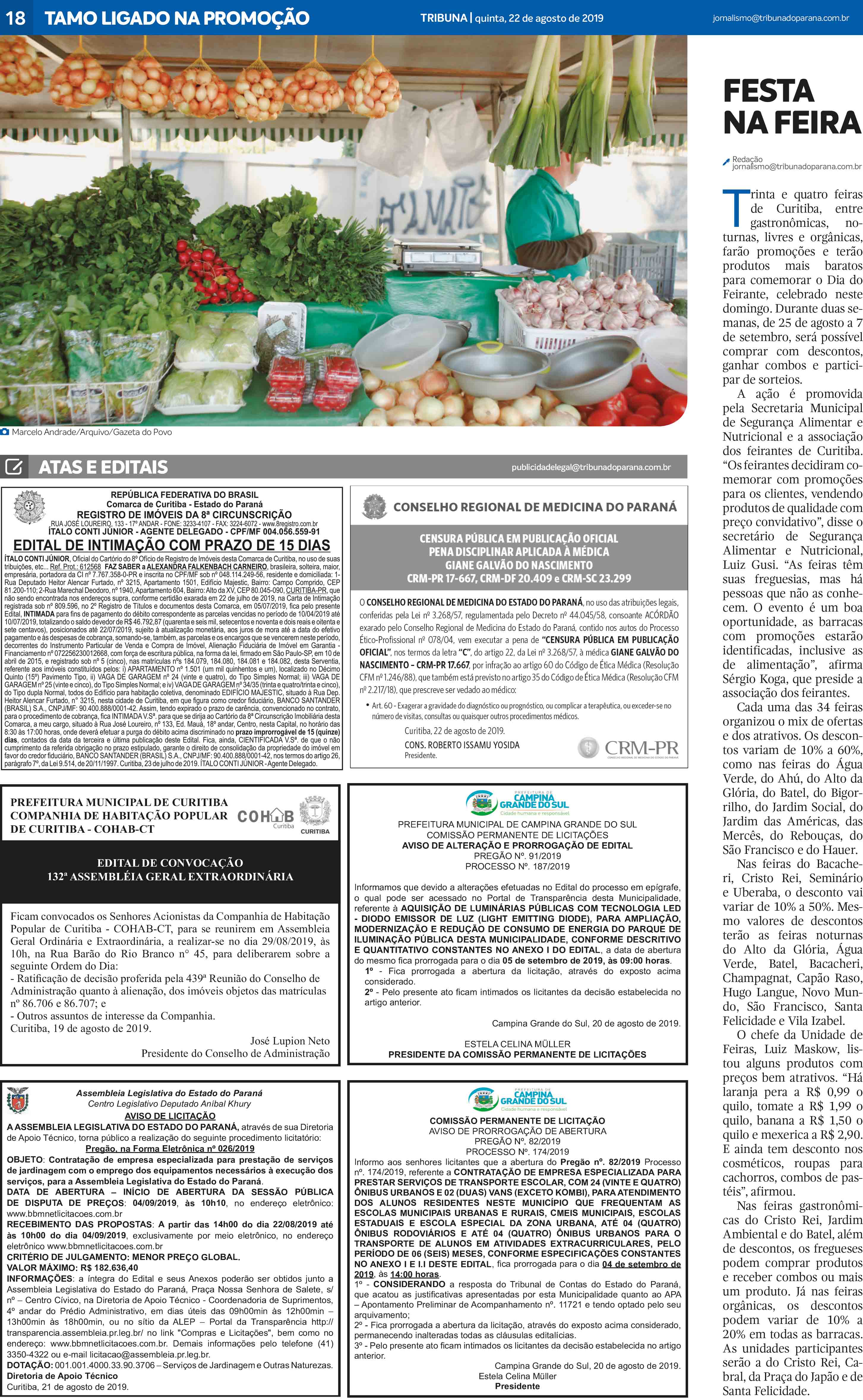 HomePublicidade LegalMatéria /Publicidade Legal – 22/08/2019 Publicidade Legal veiculada no jornal Tribuna do Paraná, em 22 de agosto de 2019, na página 18. Fazer download Anunciantes nesta página: Assembleia Legislativa do Estado do Paraná,Conselho Regiona de Medicina do Paraná/Conselho Regional de Medicina do Paraná,Prefeitura Municipal de Campina Grande do Sul,Prefeitura Municipal de Curitiba - COHAB,Republica Federativa do Brasil