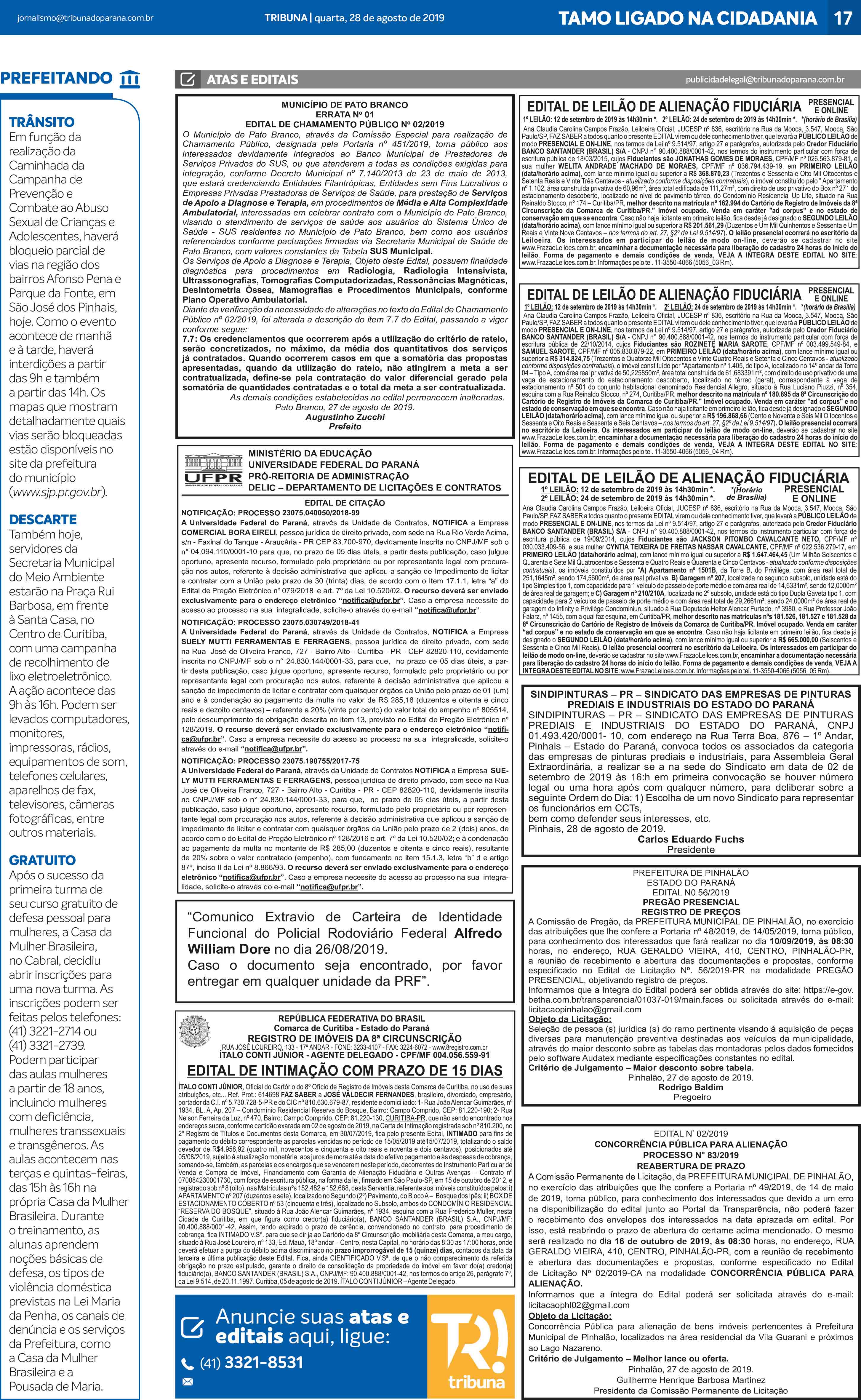 HomePublicidade LegalMatéria Publicidade Legal – 28/08/2019 Publicidade Legal veiculada no jornal Tribuna do Paraná, em 28 de agosto de 2019, na página 17. Fazer download Anunciantes nesta página: Extravio - Alfredo William Dore,Leilão de alienação fiduciária - Presencial e On-Line,Município de Pato Branco - PR,Prefeitura de Pinhalão,República Federativa do Brasil,Sindipinturas- PR,UFPR - Ministério da Educação