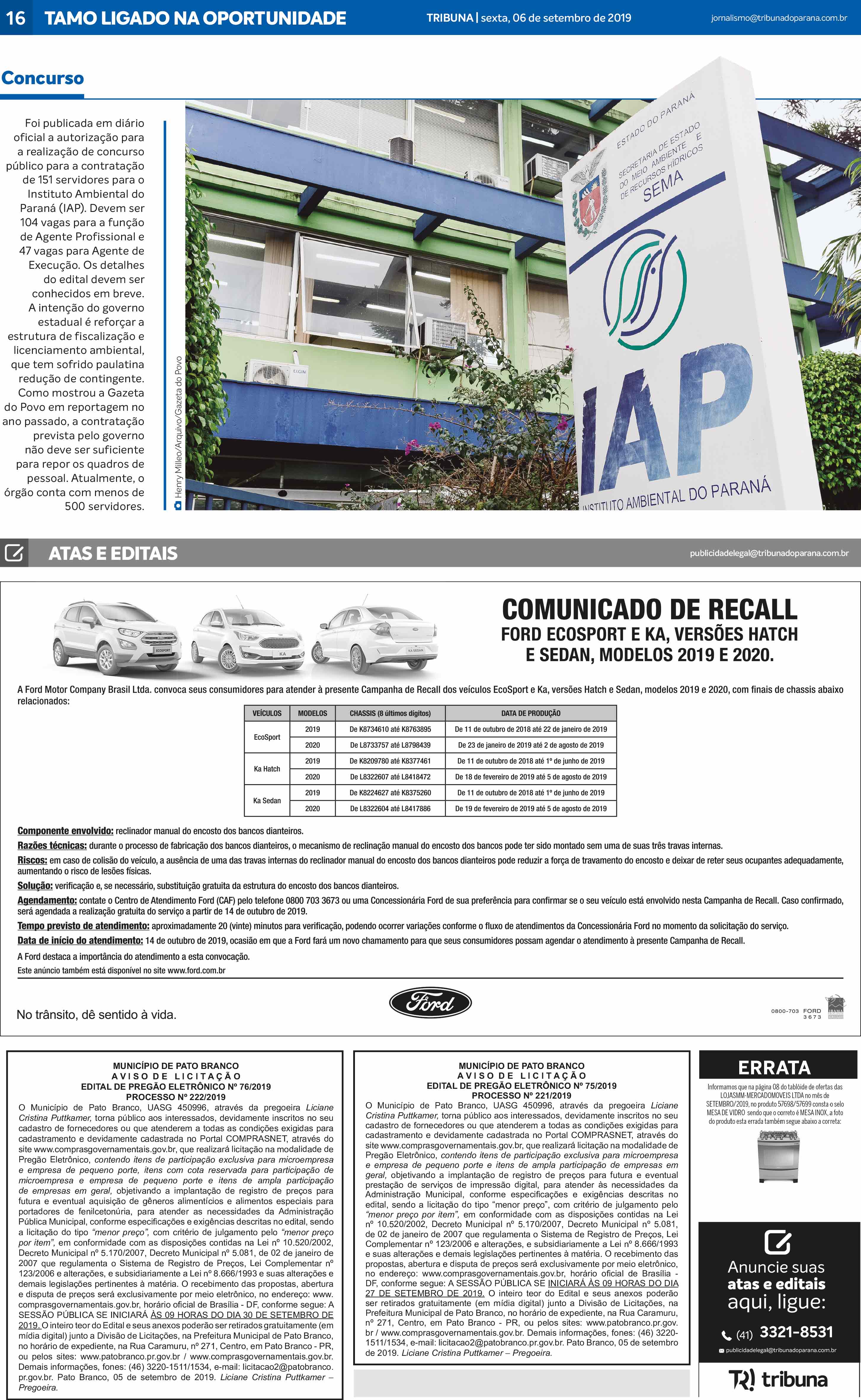 Publicidade Legal veiculada no jornal Tribuna do Paraná, em 6 de setembro de 2019, na página 16.