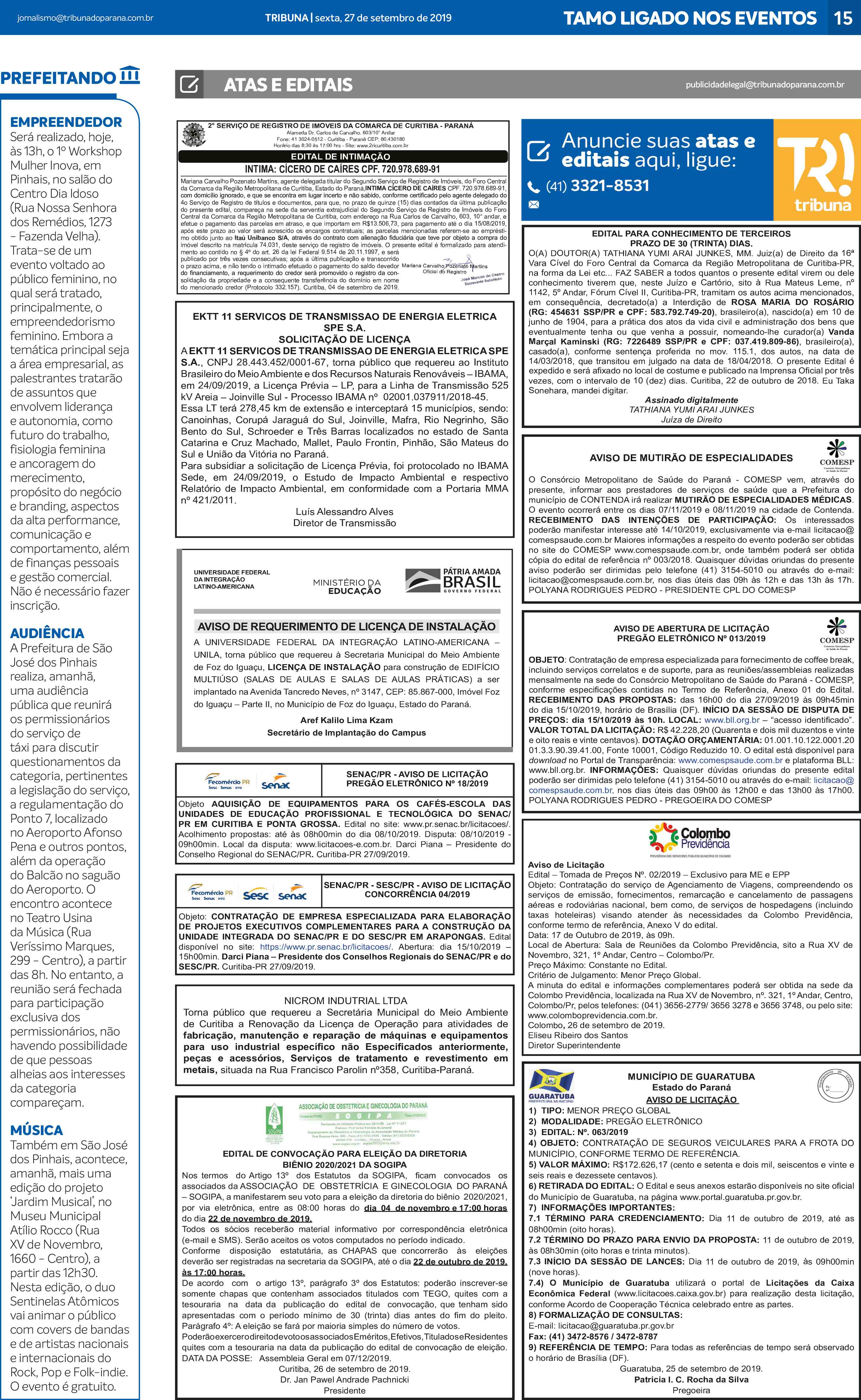 Publicidade Legal veiculada no jornal Tribuna do Paraná, em 27 de setembro de 2019, na página 15.