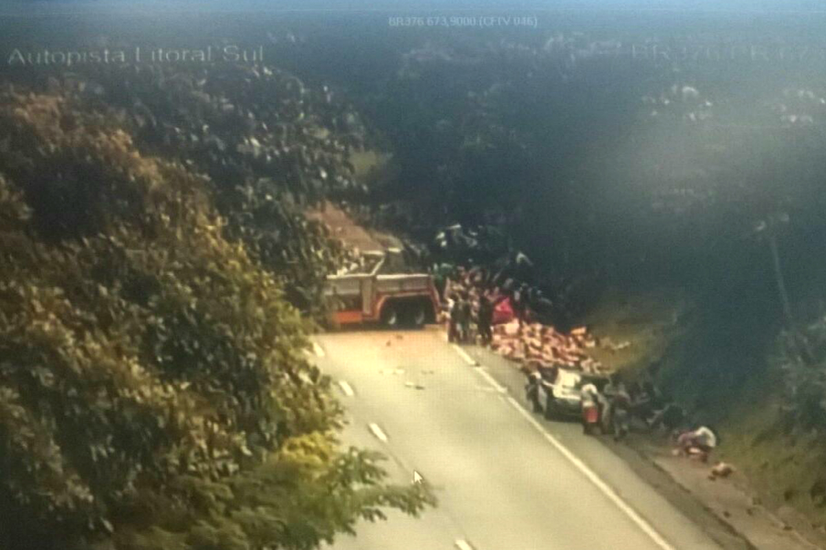 Quatro feridos! Atenção motorista! Caminhão tomba na BR-376 e faixas ficam bloqueadas 06/02/2017 - 11:15