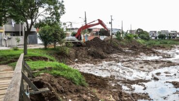 Prevenção de cheias Contra alagamentos na CIC, Prefeitura de Curitiba limpa bacia de contenção de águas pluviais 20/01/2023 - 14:13