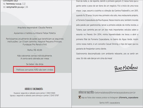Redes Sociais ‘Políticos corruptos não são bem-vindos’, escreve empresário em cardápio 26/08/2015 - 18:42