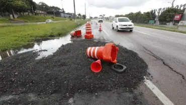 Risco na pista “Vão esperar alguém cair?” Buraco na BR-277 está há dois meses sem solução 22/02/2024 - 15:31