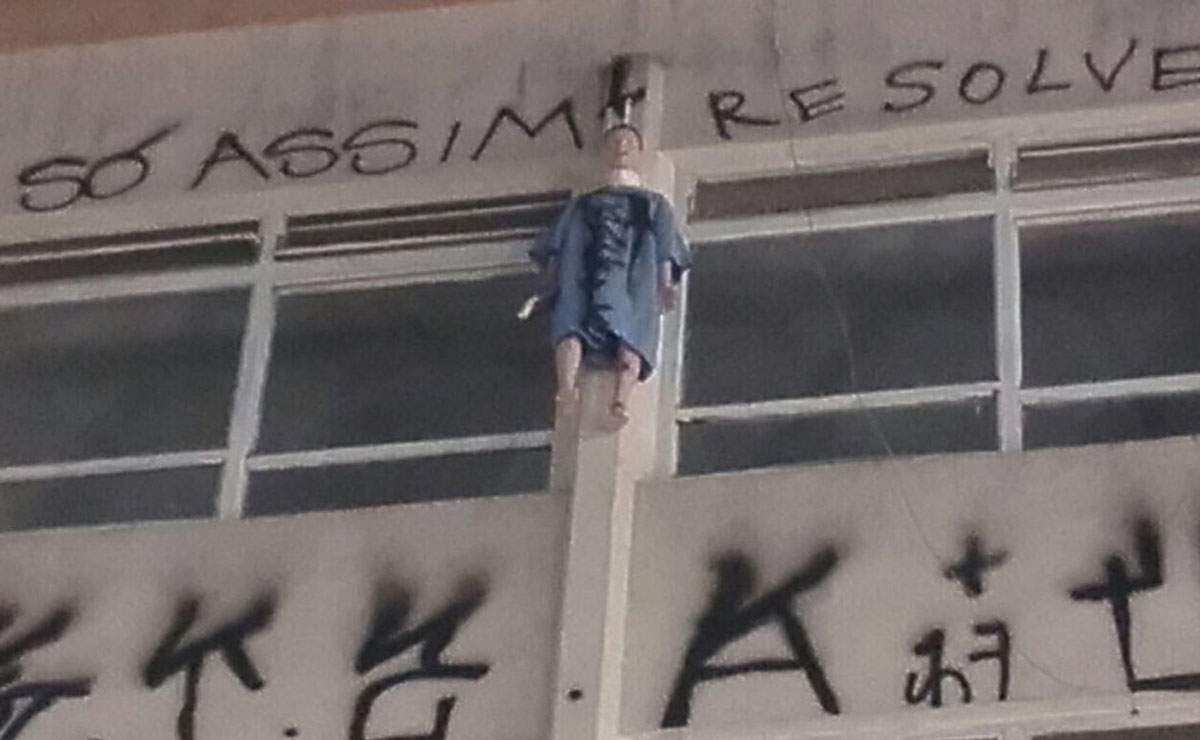 Em Curitiba Faculdade no Centro amanhece com boneco enforcado e mensagem hostil a Greca 08/08/2017 - 12:22
