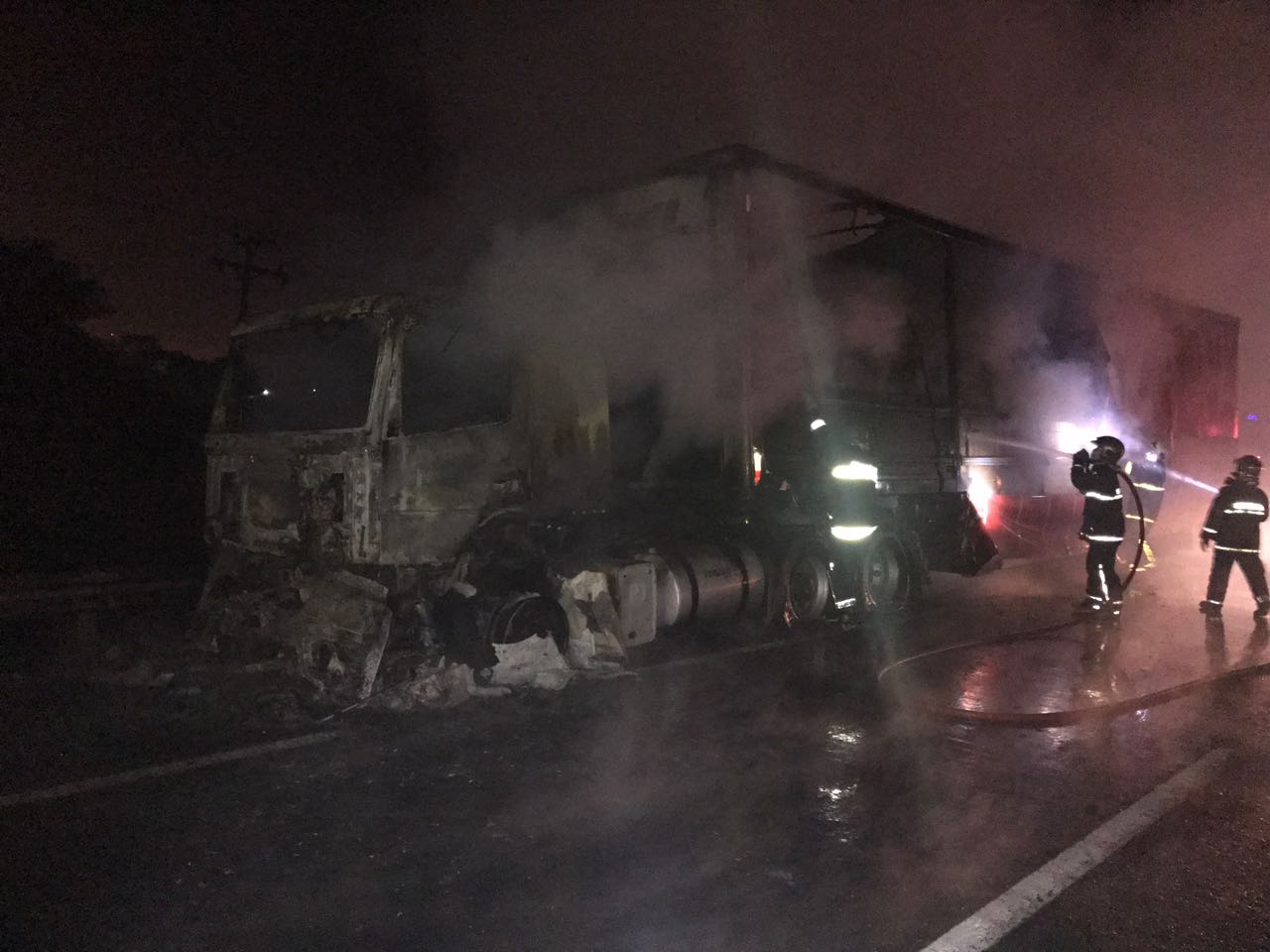 Caminhão pega fogo e interdita rodovia no sentido ao litoral