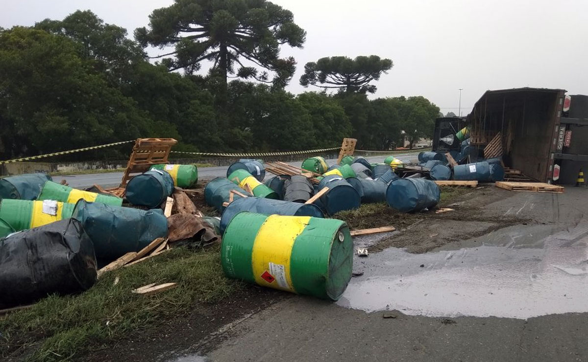 Carga na pista Caminhão carregado com produto perigoso tomba e complica Contorno Sul 22/02/2018 - 08:23
