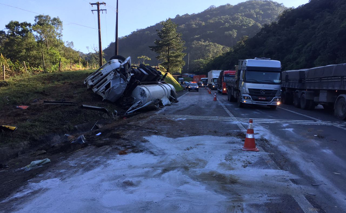 Curva da Santa Caminhão com carga perigosa tomba na BR-376 e congestionamento chega a 6 km 13/07/2017 - 08:10