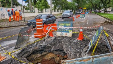Consequência da chuva “Cratera” em asfalto deixa avenida parcialmente bloqueada em Curitiba 14/12/2022 - 19:18