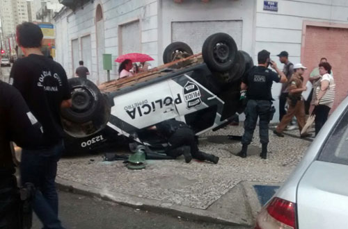 Viatura fura o sinal, bate em carro e capota no Centro