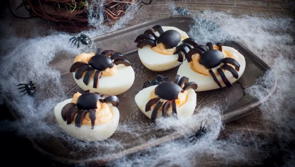 Transforme ovos recheados em “aranhas” assustadoras com a ajuda de azeitonas pretas!