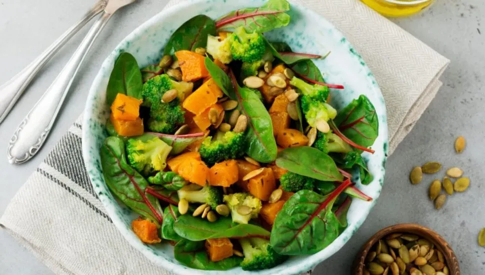 Em uma assadeira, distribua os cubos de abóbora-moranga. Regue com 1 colher de sopa de azeite e tempere com sal e pimenta-do-reino. Leve ao forno preaquecido a 180 °C por cerca de 20 minutos, até ficar macia. Enquanto isso, cozinhe os floretes de brócolis em água fervente com uma pitada de sal por 3 minutos em uma panela em fogo médio. Escorra e reserve. Em uma tigela grande, coloque as folhas de beterraba, a abóbora-moranga e o brócolis. Regue com o restante do azeite e com o suco de limão. Misture delicadamente. Polvilhe as sementes de abóbora e sirva em seguida.