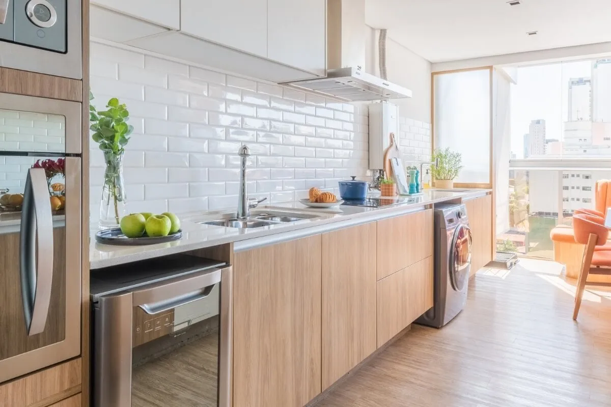 De acordo com Júlia Guadix, o minimalismo na cozinha também enfatiza a maximização do espaço e a ocultação de itens, como eletrodomésticos, para a criar um ambiente sereno, calmo e sem excessos, favorecendo a funcionalidade e a simplicidade na rotina diária. “Gosto muito dessa mistura dos revestimentos brancos, que lembram os metrôs de Londres e Nova York, com a madeira clara. Na bancada, usamos o quartzo branco com granulações, lembra um granilite”, recorda.