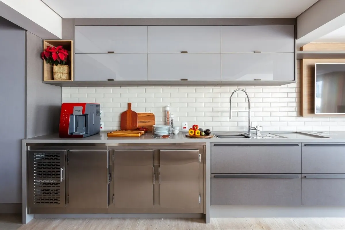 - Eletrodomésticos: aparelhos utilizados com frequência que tenham um design legal e em bom estado, podem ficar aparentes e sempre à mão, como as cafeteiras e torradeiras, por exemplo. Os menos usados podem ser guardados em um armário projetado especialmente para eles.