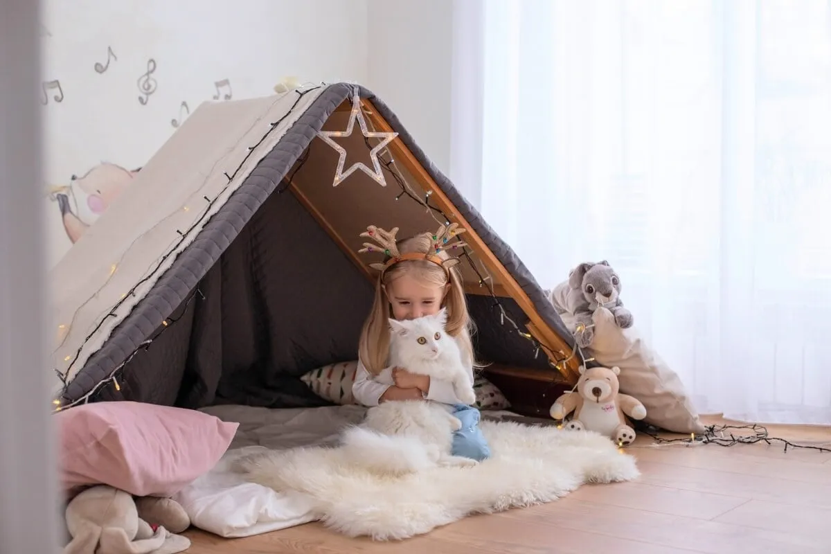 A cabana sensorial é uma brincadeira clássica, mas com a adição de elementos a serem explorados. O convite é para que as famílias construam suas cabanas a partir da imaginação, amarrando cobertores, cangas em galhos de árvore ou até toalhas em cima das cadeiras, mas deixem sempre novos objetos para os bebês encontrarem. Eles podem estar amarrados no teto da cabana, escondidos debaixo do tapete ou podem estar dentro de “cesto de tesouros”. É possível notar que algumas crianças arrumam os objetos, outras tiram tudo do lugar. Nessa fase, a desorganização é uma forma de organizar o pensamento.