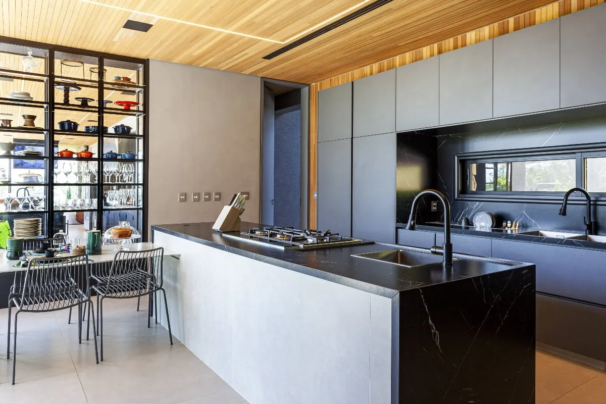 Outra recomendação simples, porém valiosa, diz respeito à setorização. O pensamento empregado pela arquiteta consiste em determinar áreas específicas — como despensa, preparo, cocção e limpeza —, conforme as necessidades de cada cozinha.