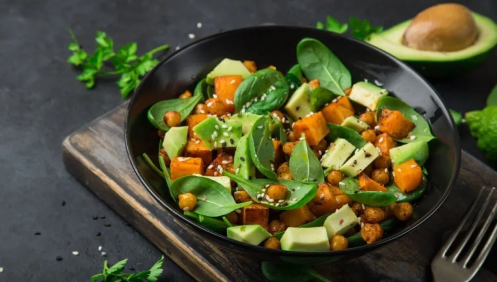 Salada de batata-doce com grão-de-bico, abacate e espinafre