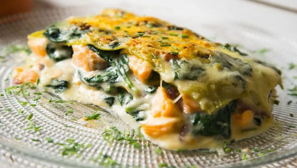 Lasanha de salmão com ora-pro-nóbis e queijo