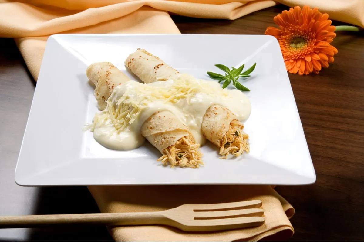 Recheie as panquecas com o frango e enrole. Disponha-as em uma forma untada com azeite e leve ao forno preaquecido em temperatura média por 10 minutos. Retire do forno, cubra com o molho branco e salpique com queijo ralado. Sirva em seguida.