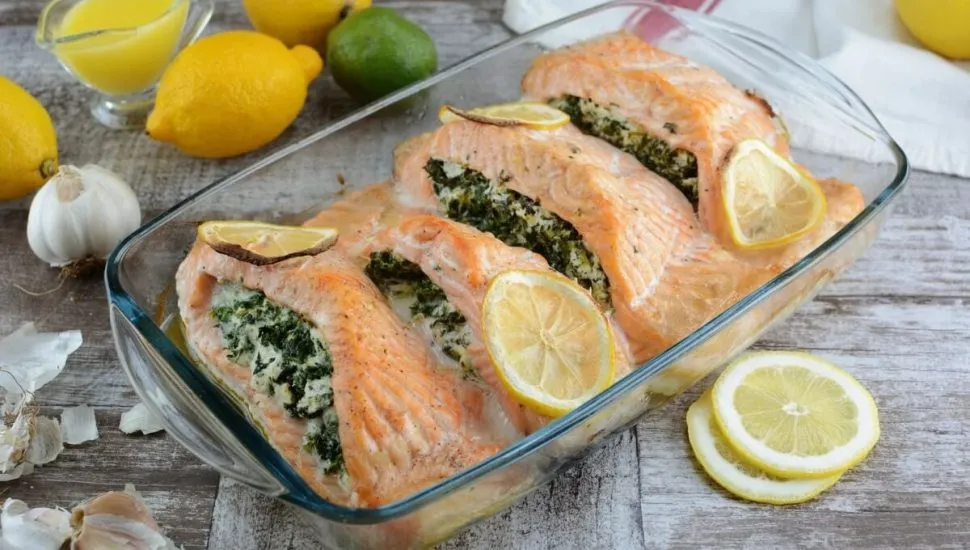 Com a ajuda de uma faca, corte o centro dos pedaços de salmão no sentido da lateral, sem separar completamente as partes. Recheie com o espinafre e disponha-os em um refratário untado com azeite. Regue com suco de limão e disponha as rodelas sobre o peixe. Leve ao forno preaquecido em temperatura média por 20 minutos. Retire do forno e sirva em seguida.