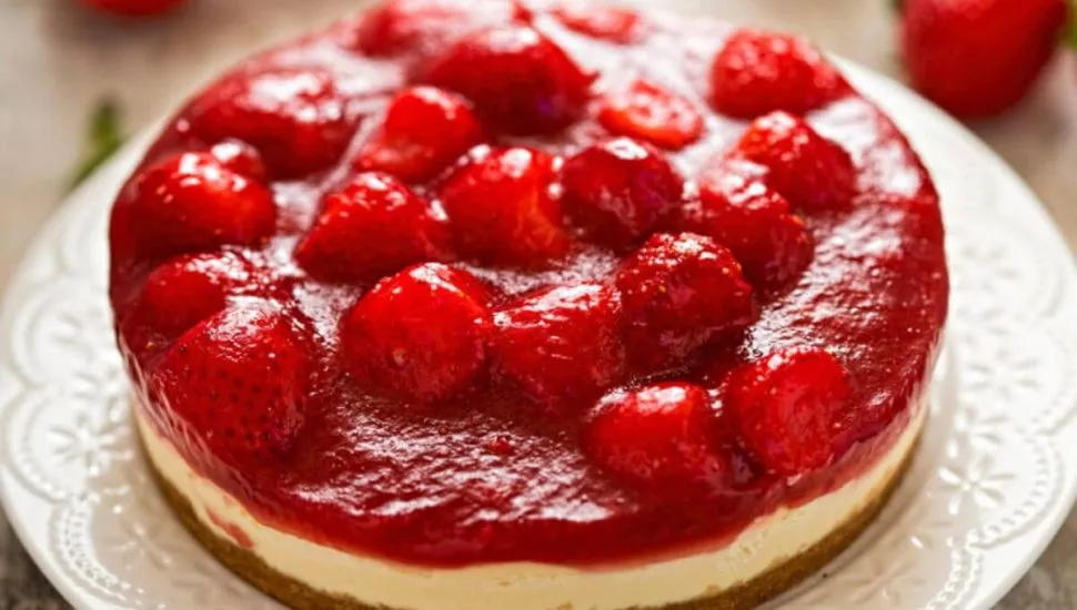 Em um recipiente, coloque a gelatina e hidrate conforme orientação da embalagem. Após, transfira para um liquidificador, coloque metade dos morangos e bata até incorporar. Despeje a mistura sobre o cheesecake, decore com os morangos e leve à geladeira por 4 horas. Desenforme com cuidado e sirva em seguida.
