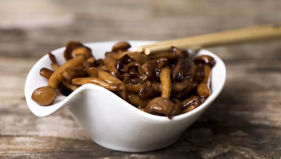 Separe os floretes de shimeji. Em uma frigideira, coloque o azeite e leve ao fogo médio para aquecer. Adicione o shimeji e refogue por 1 minuto. Acrescente o alho e o molho de soja e misture bem. Refogue até caramelizar. Sirva em seguida.