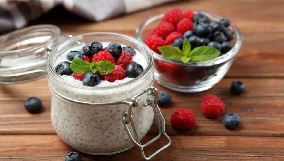 Misture a chia com o leite vegetal e o mel em um pote com tampa. Agite bem ou mexa até dissolver por completo. Leve à geladeira por aproximadamente 4 horas ou de um dia para o outro. Sirva com frutas vermelhas por cima.