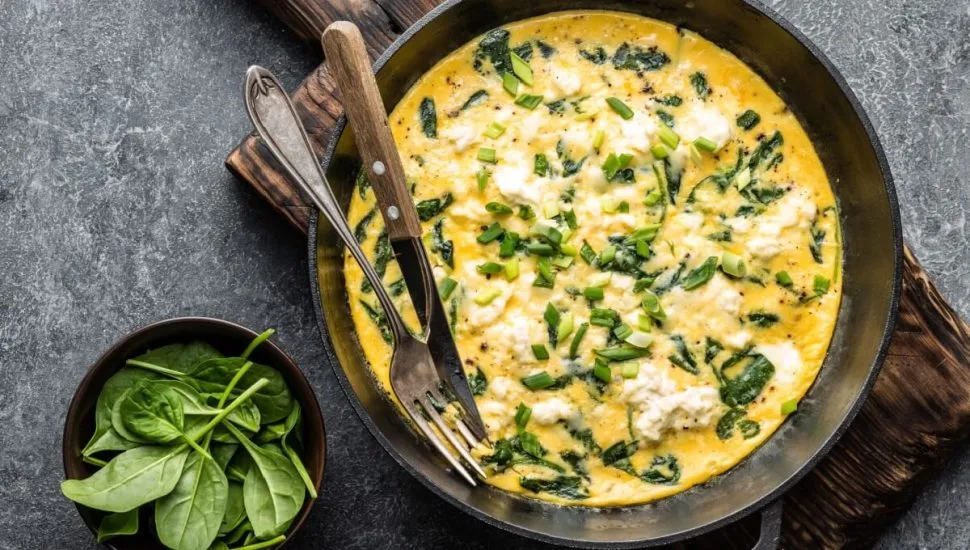 Em uma tigela, bata o ovo com o polvilho e o sal até ficar homogêneo. Reserve. Em uma frigideira, em fogo médio, aqueça o azeite e refogue o alho. Adicione o espinafre e tempere com sal e pimenta-do-reino. Refogue até murchar. Em seguida, adicione a mistura reservada e o queijo. Cozinhe até dourar. Sirva com a cebolinha.
