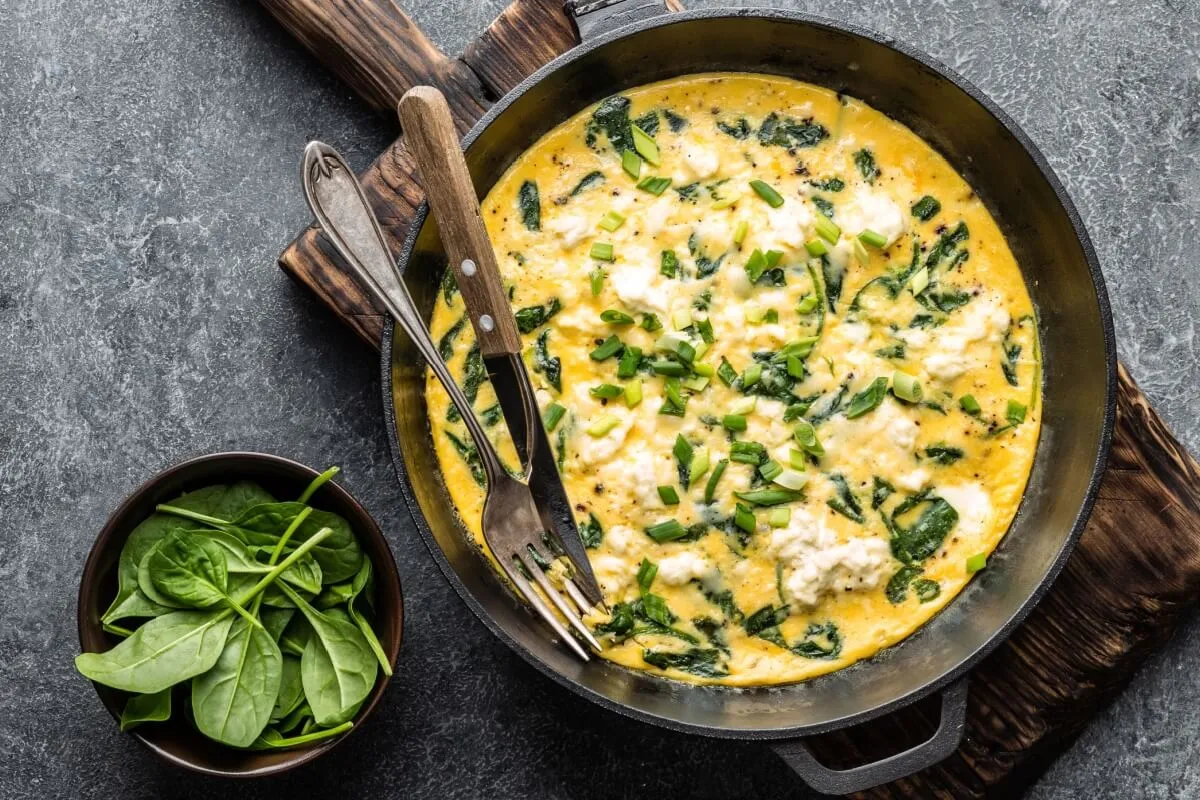 Em uma tigela, bata o ovo com o polvilho e o sal até ficar homogêneo. Reserve. Em uma frigideira, em fogo médio, aqueça o azeite e refogue o alho. Adicione o espinafre e tempere com sal e pimenta-do-reino. Refogue até murchar. Em seguida, adicione a mistura reservada e o queijo. Cozinhe até dourar. Sirva com a cebolinha.