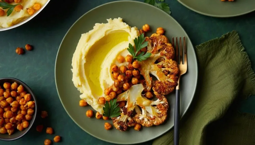Escorra e bata no processador com 1 dente de alho, 1 colher de sopa de azeite e o leite vegetal, até obter um purê liso e cremoso. Tempere com sal e pimenta-do-reino. Monte o prato com uma porção de purê de couve-flor, disponha por cima o grão-de-bico crocante e as fatias assadas de couve-flor. Finalize com folhas frescas de salsa e sirva quente.
