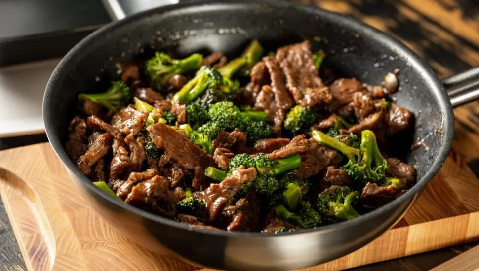 Em um recipiente, coloque a carne e tempere com sal, pimenta-do-reino e vinagre de arroz. Reserve. Em uma panela, coloque o azeite e leve ao fogo médio para aquecer. Adicione a cebola e o alho e doure. Junte a carne e refogue até perder a cor avermelhada. Em um recipiente, dilua o amido de milho no caldo de legumes. Acrescente o brócolis à panela com a carne e misture. Adicione o caldo de legumes e cozinhe até o legume ficar macio. Desligue o fogo e sirva em seguida.