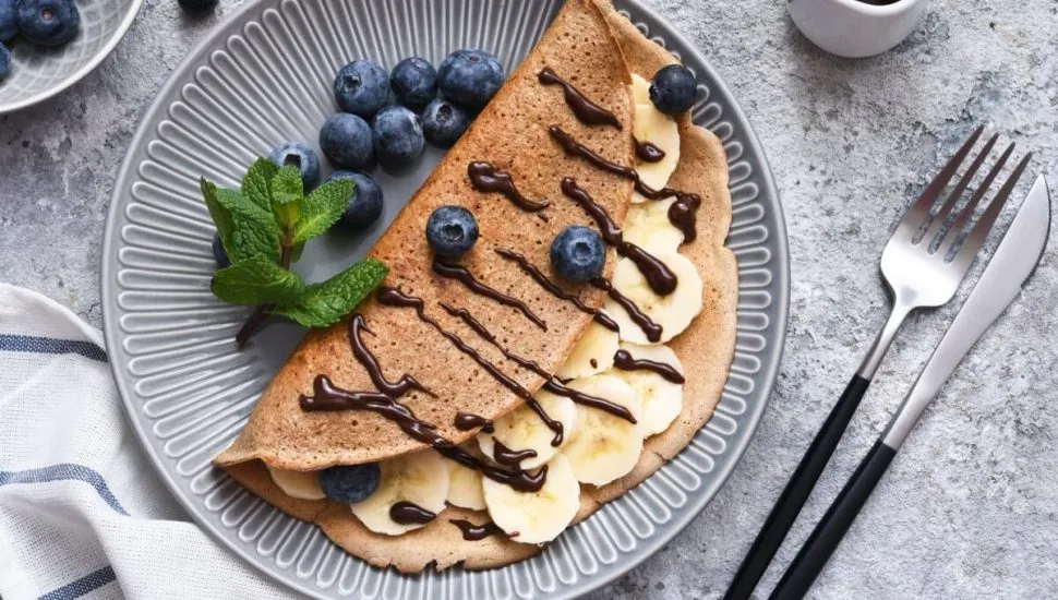 Aqueça uma frigideira antiaderente em fogo médio. Unte com a manteiga de coco spray e coloque uma concha da massa sobre ela. Frite até dourar e vire para dourar o outro lado. Repita o processo com o restante da massa e disponha as panquecas em um prato. Sirva acompanhado com calda de chocolate, rodelas de banana e mirtilo.