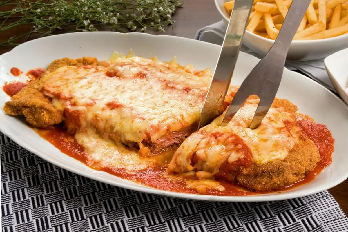Coloque os bifes fritos em uma forma. Cubra com uma boa quantidade de molho de tomate. Adicione as fatias de muçarela e polvilhe com queijo parmesão ralado. Leve ao forno preaquecido a 200 °C por cerca de 10 minutos, ou até que o queijo esteja derretido e levemente dourado. Sirva em seguida.