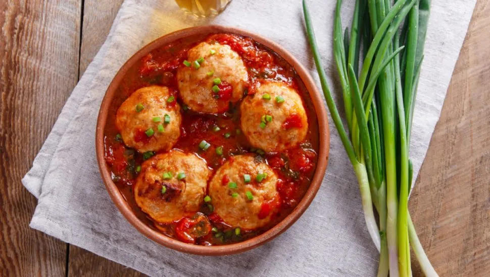 Após, com uma colher, pegue pequenas porções e modele no formato de bolinhas. Disponha em uma forma untada com azeite de oliva e leve ao forno preaquecido em temperatura média até dourar. Retire do forno e acrescente o molho de tomate. Sirva decorado com cebolinha.