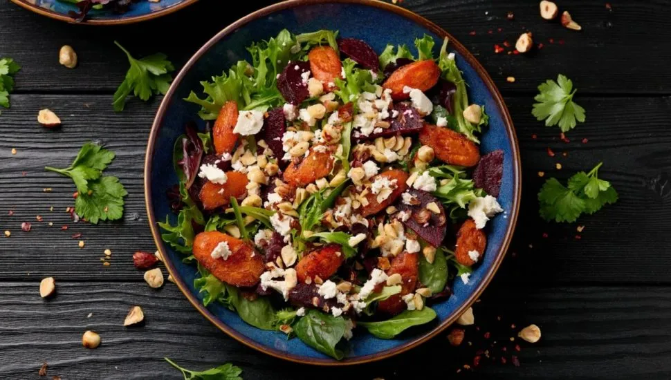 Salada morna de beterraba com cenoura, queijo feta e avelãs (Imagem: DronG | Shutterstock)