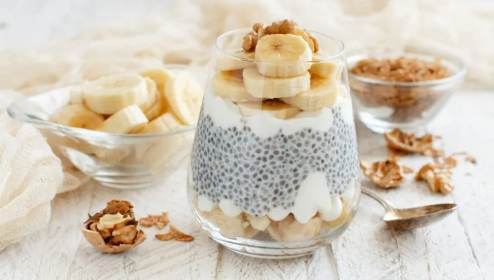 Em um recipiente, misture o leite de amêndoas, as sementes de chia e o mel. Leve à geladeira por 30 minutos. Após, em potes individuais, coloque uma camada de banana, nozes, iogurte e pudim de chia. Finalize com uma camada de iogurte, banana e nozes. Sirva em seguida.