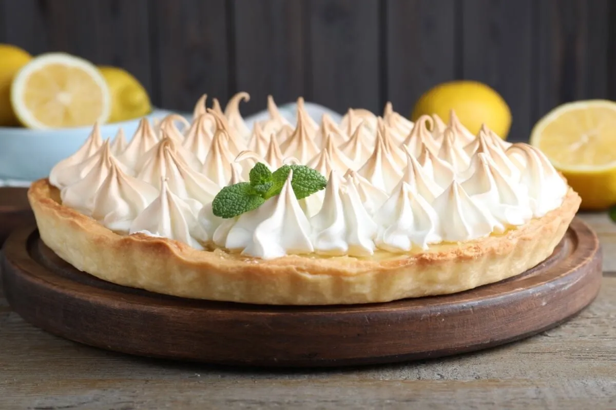 Para o merengue, aqueça as claras com o açúcar em banho-maria, mexendo sempre, até dissolver os grãos (cerca de 65 °C). Bata na batedeira com as gotas de limão até formar picos firmes e brilhantes. Transfira para um saco de confeitar com bico pitanga e decore a torta. Use um maçarico para dourar o merengue ou leve ao forno bem quente por poucos minutos. Finalize com hortelã para decorar.