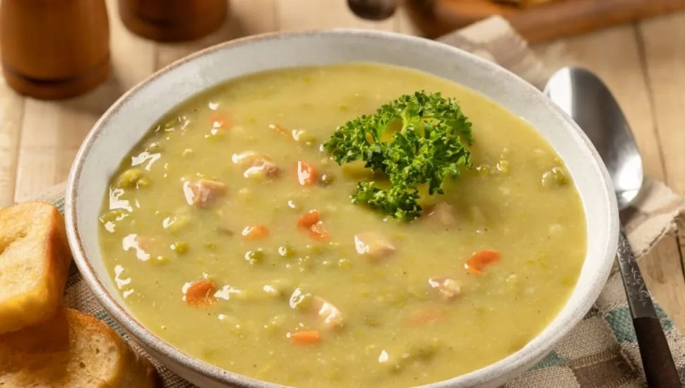 Sopa cremosa de ervilha com legumes e bacon