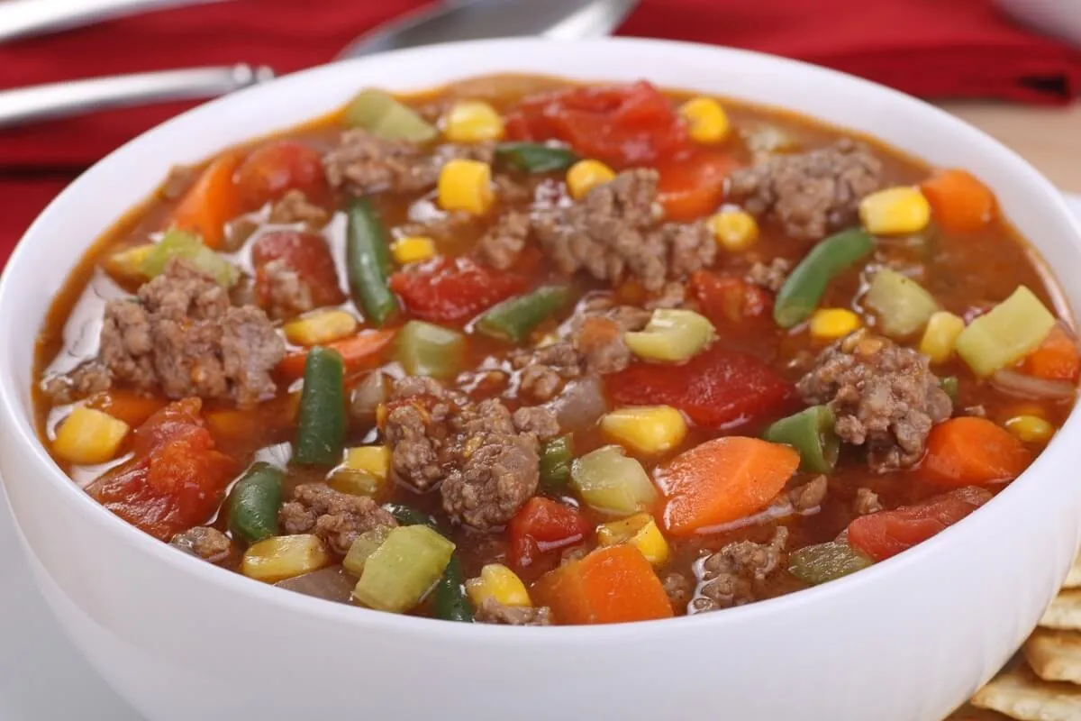 Em uma panela, coloque o azeite e leve ao fogo médio para aquecer. Refogue a cebola e o alho até dourar. Adicione a carne e frite até perder a cor avermelhada e ficar soltinha. Junte o caldo de carne, o tomate, o molho de tomate, o sal e a pimenta-do-reino e cozinhe até levantar fervura. Junte os legumes (chuchus, cenouras, vagem e milho-verde) e cozinhe até ficarem macios. Desligue o fogo e sirva em seguida.