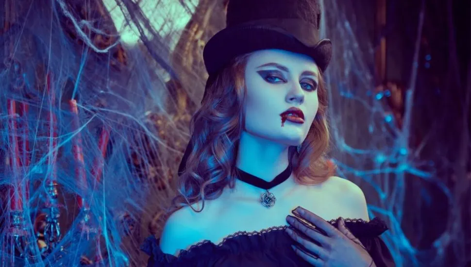 Para quem busca uma opção simples, a maquiagem de vampiro continua sendo uma escolha atemporal para o Halloween. A base de um vampiro clássico começa com um rosto pálido, que contrasta perfeitamente com olhos intensamente sombreados em cores escuras. Use tons pretos, roxos ou vinho para criar um olhar penetrante, típico das lendas de vampiros. Para finalizar a produção, use batons tingidos de vermelho-sangue, uma cor simbólica que remete à fome e ao lado sombrio da criatura.