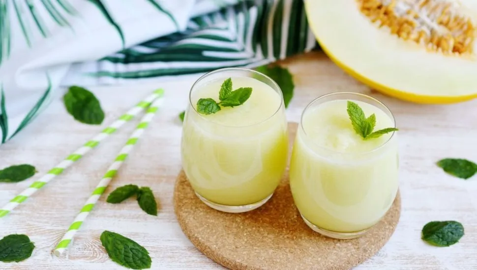 Coloque o melão, o leite, as folhas de hortelã, o whey protein e o mel no liquidificador e bata até obter uma vitamina espessa e cremosa. Sirva em seguida.