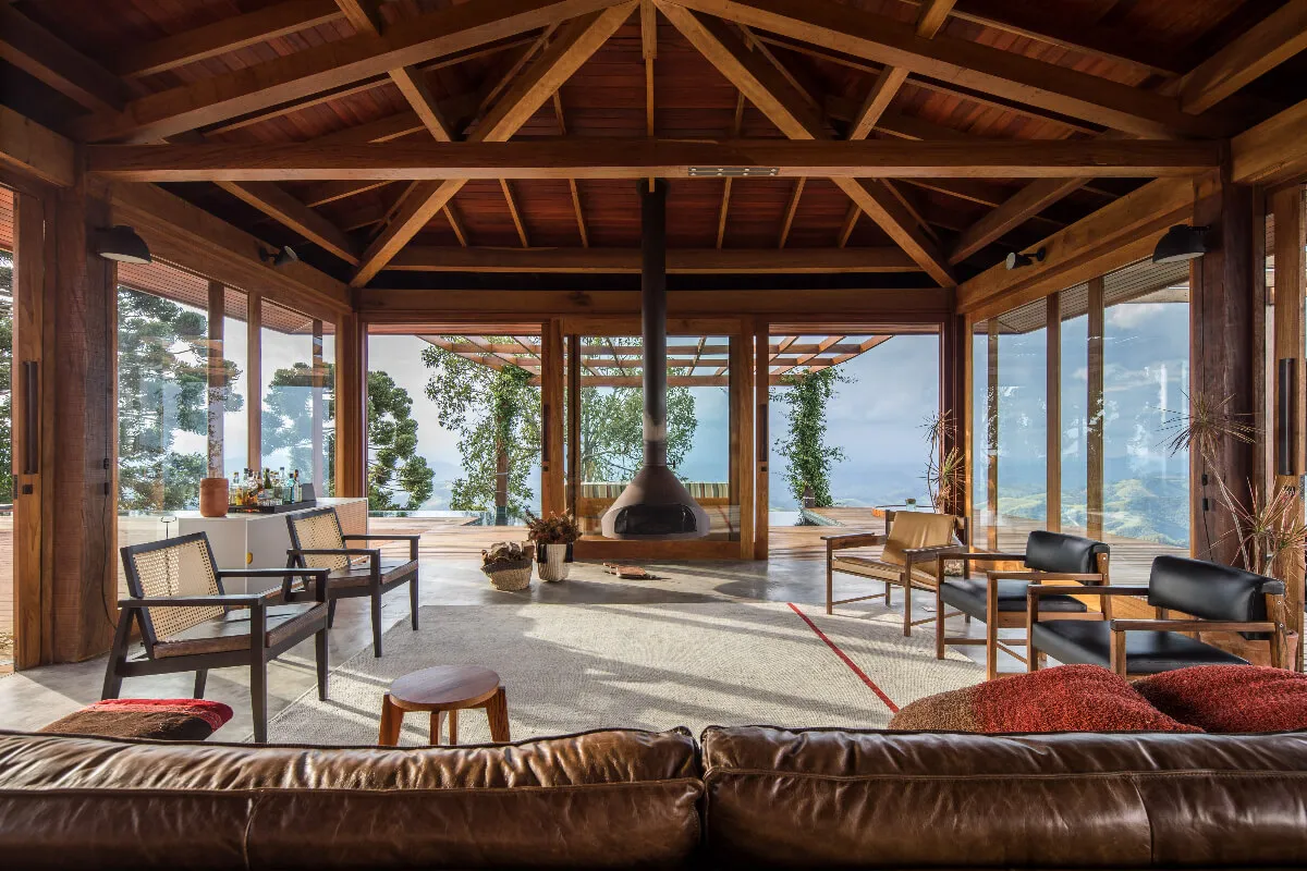 Na sala de estar, um sofá de couro e uma mesa de centro de madeira maciça, combinados com uma lareira de pedra ou um tapete de fibras naturais, resultam em um ambiente acolhedor e convidativo. Na cozinha, armários de madeira, bancadas de pedra e utensílios de cobre ou ferro, junto com prateleiras abertas que exibem cerâmicas e peças vintage, acrescentam charme e funcionalidade.