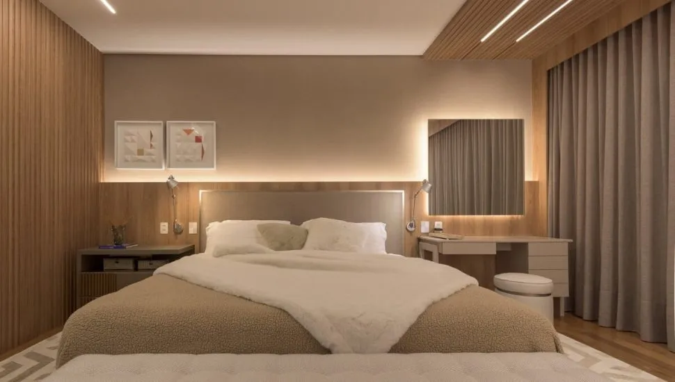Quando se trata de quartos pequenos, que podem ser de casal, crianças ou solteiros, tons claros são sinônimos de amplitude e uma melhor iluminação. As arquitetas destacam que a clássica combinação de bege e branco será sempre elegante, podendo ser aplicada como uma meia parede inferior em bege claro e a parte superior em branco, acompanhada do teto também branco.