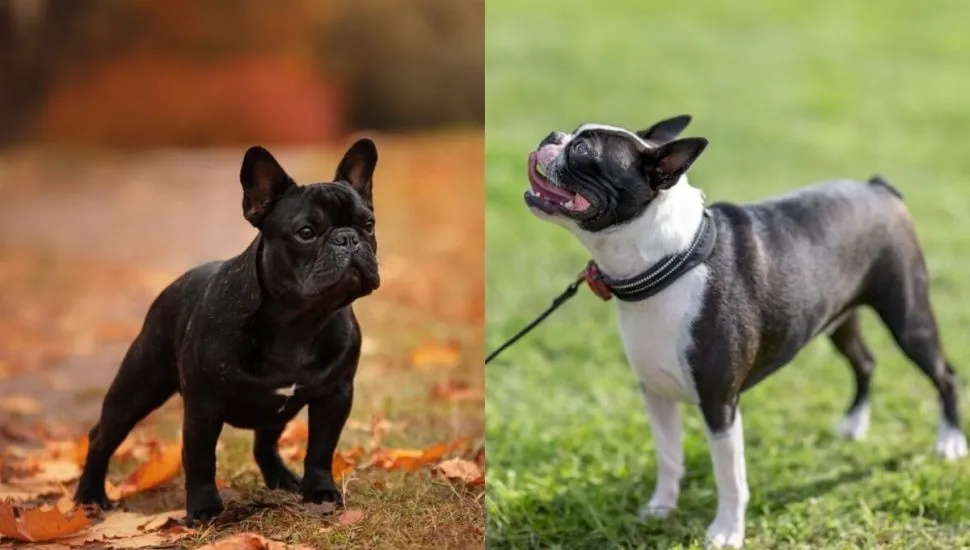 O buldogue francês tem o corpo pequeno e musculoso, com a cabeça larga e quadrada, orelhas grandes e eretas em forma de “morcego” e focinho curto. O boston terrier, por outro lado, é pequeno, mas mais elegante, com a cabeça mais estreita e uma expressão refinada, orelhas eretas e focinho curto, porém menos achatado.