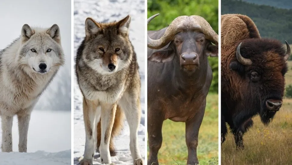 O búfalo africano é um grande mamífero encontrado na África Subsaariana. Ele tem chifres largos e curvados. Além disso, é conhecido por seu comportamento agressivo e por viver em grandes manadas. O bisão-americano e o bisão-europeu são grandes herbívoros encontrados na América do Norte e na Europa, respectivamente. Eles têm uma pelagem mais espessa, especialmente em torno dos ombros, e os chifres são mais curtos e curvados para trás.