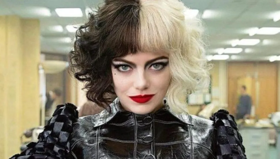 Emma Stone como Cruella, usando roupa preta, cabelo bicolor preto e branco e batom vermelho